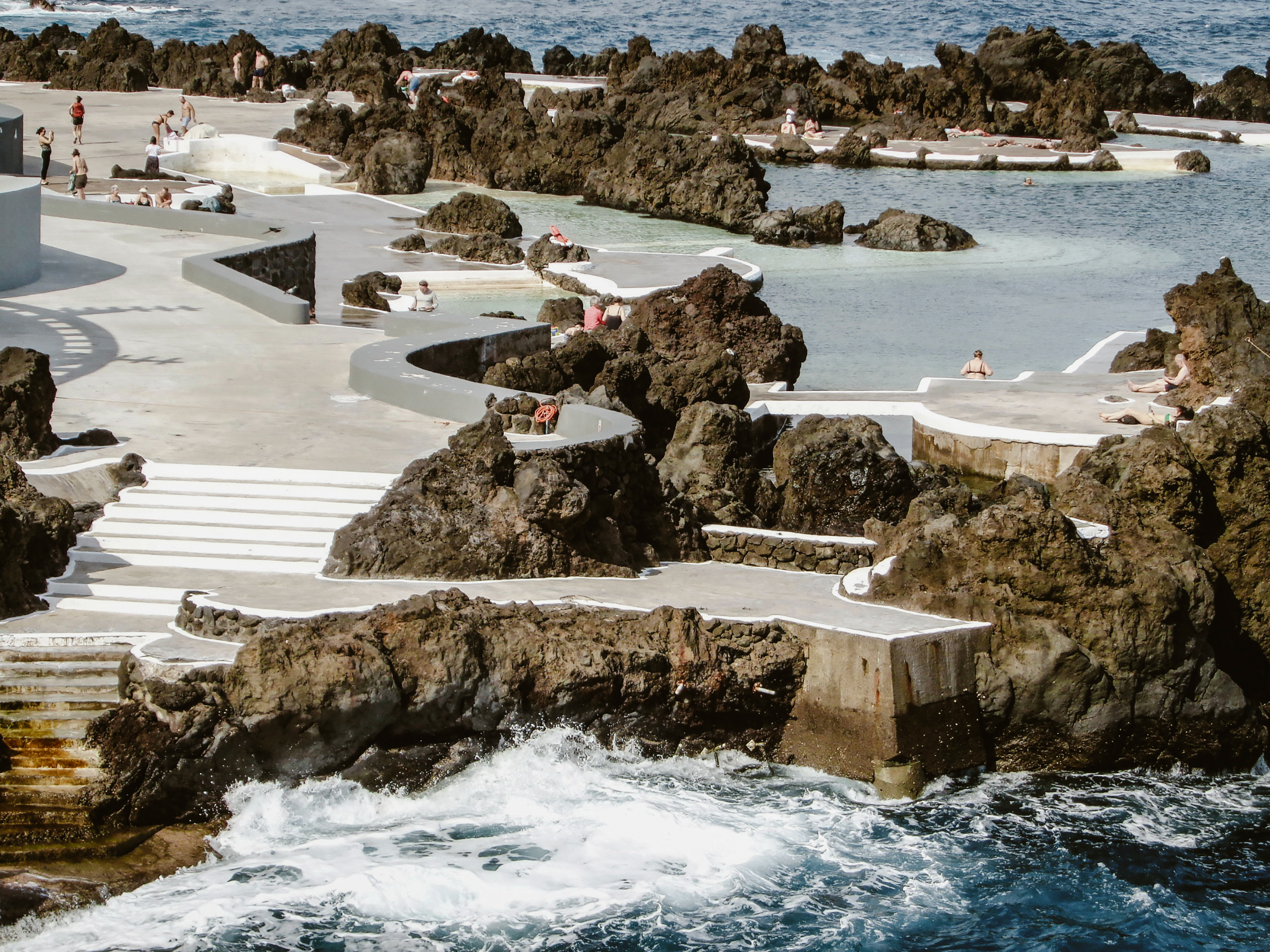 Weiter geht es nach Porto Moniz, wo die berühmten natürlichen Lavapools zum Baden einladen. Diese einzigartigen Becken aus erkalteter Lava sind ein faszinierendes Naturphänomen. Der schwarze Sandstrand von Seixal, umgeben von üppigem Grün, bietet einen ruhigen Ort für eine Pause.